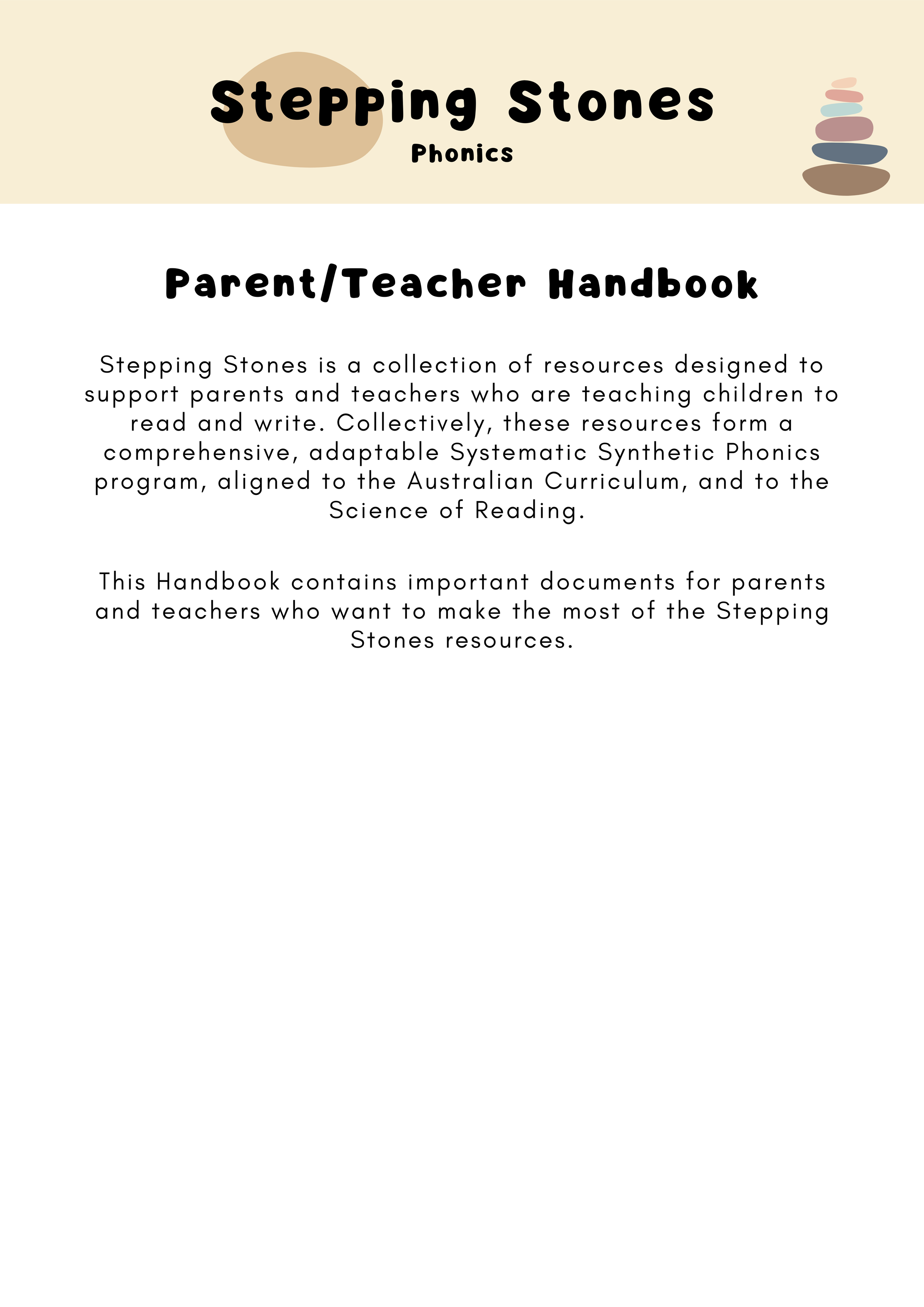 The Stepping Stones Parent and Teacher Handbook contains useful information and resources for parents and teachers wishing to use the Stepping Stones program to teach children to read. On this page, you can download the entire Handbook as one PDF document, or download the resources contained within the Handbook separately, as needed.